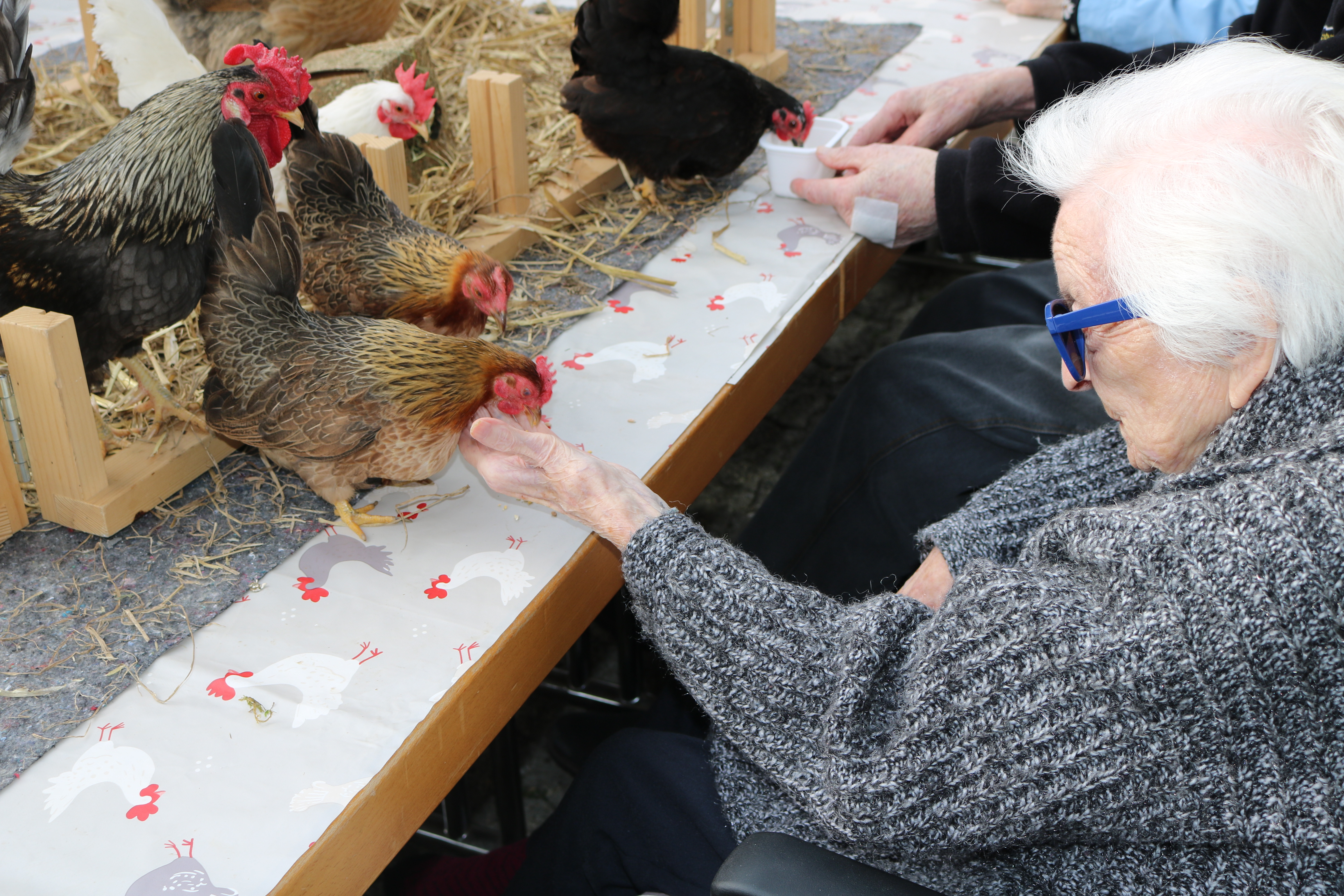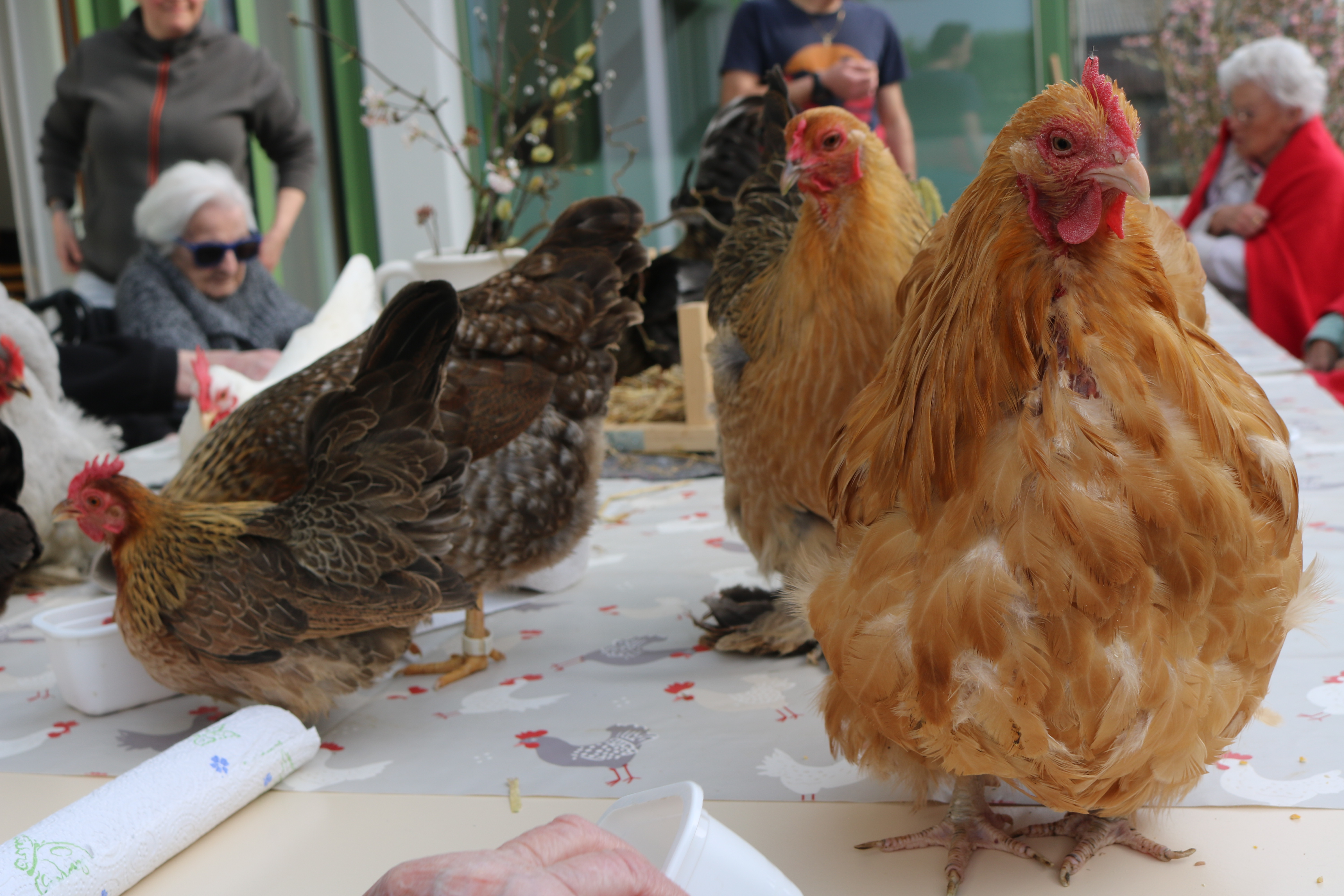 Die gefiederten Gäste sorgten im Spycher für viele lachende Gesichter. Die Bewohnerinnen und Bewohner streichelten die Hühner, erinnerten sich an früher und genossen den etwas anderen Besuch.